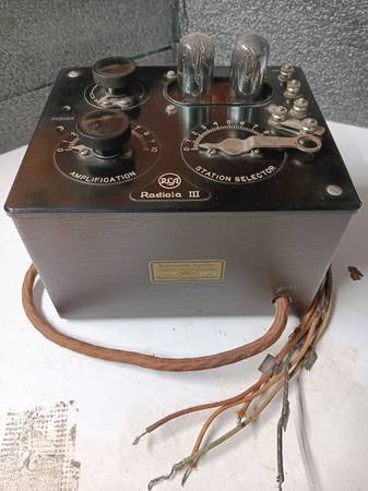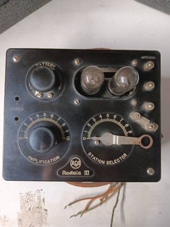 Working, original Radiola 3. Comes with two usable WD-11 tubes. Nice shape, original finish on case. Good decal, metal tags on the battery wires. There is some loss of the plating on the tuning control.