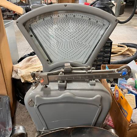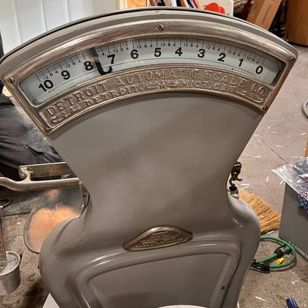Beautiful Detroit Automatic Scale Co. in excellent condition. Paint is sharp. Glass is clear and unbroken. Works and includes weights and pan. Rated for 110lbs