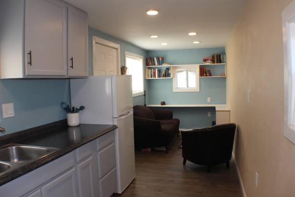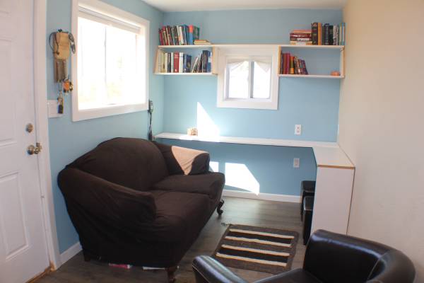 -Living Room: Cozy space with built-in bookshelves, desk, and two windows for natural light.