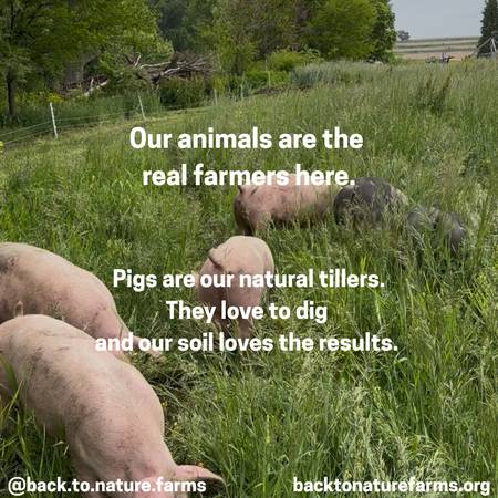 🐖 Our pigs are expert tillers! They root and dig through the soil, turning it over and mixing in organic matter. This helps break down old plant material and prepare the ground for new growth.