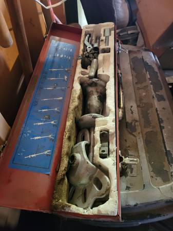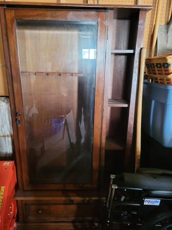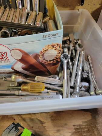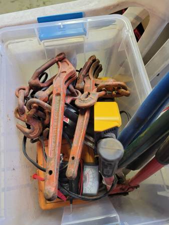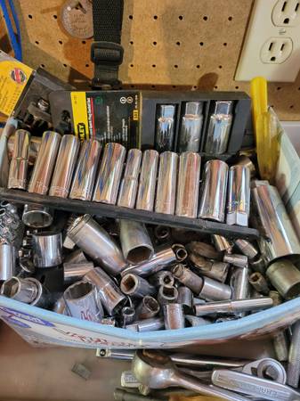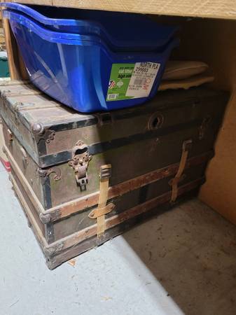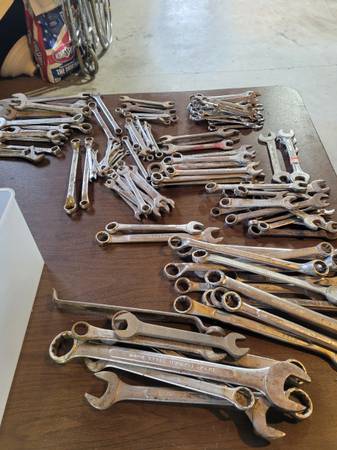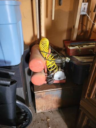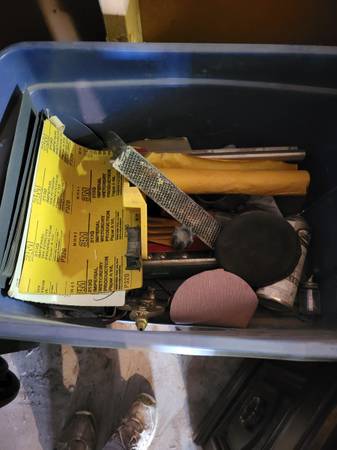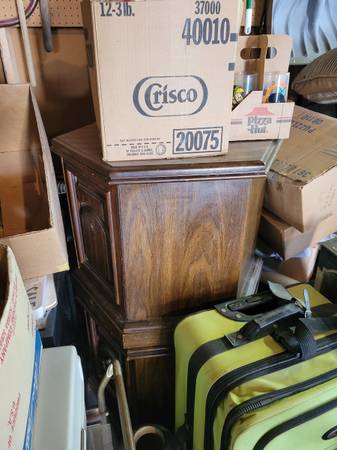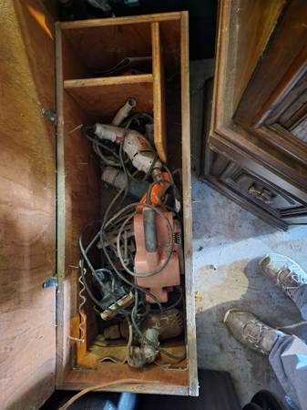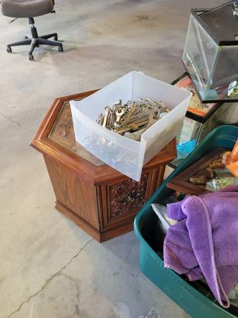 Old trunk--$30; chest of drawers--$30; full size bed set--$50; misc car repair eqip--$50; auger/drill--$70; solid wood box with misc electric tools--$75; dent puller--$25; air compressor--$30; craftsman leaf blower--$15; 6 gun wood with glass door gun cabinet--$300; 5 end tables--$5 each; wood coffee table--$10; black TV stand with glass shelf--$10; box full of misc bits--$25; box if sockets--$50; box of misc wrenches--$25; room humidifier--$75; box of misc tools--$20; box of numerous wrenches--$50
